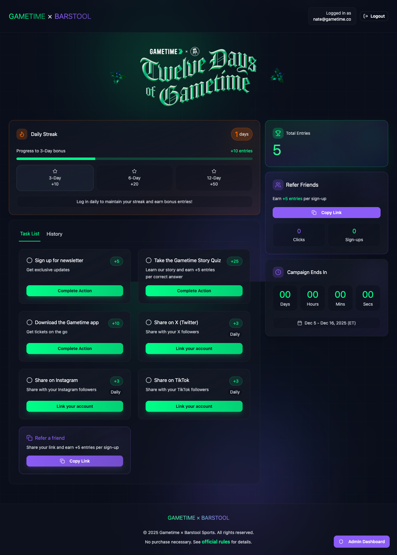 Fully custom interactive microsite with daily giveaways, streak mechanics, referrals, and lifecycle integrations.
