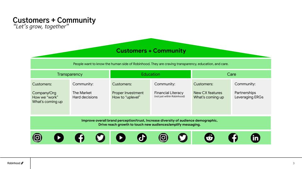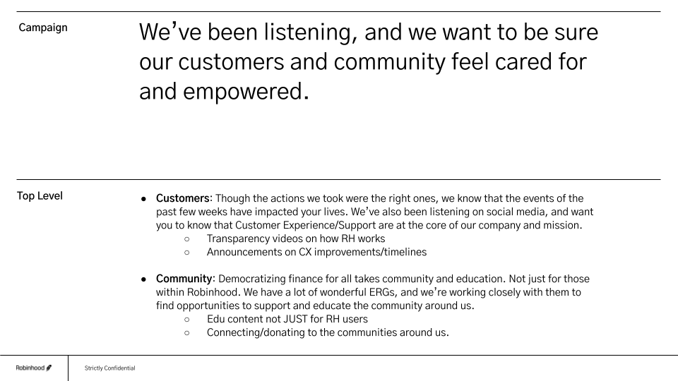 After activating the team on some educational content, the c-team quickly wanted creative ideas to combat the negative chatter from a group they called "The Fringe Fighters." (people who were on the fringe/cusp of leaving Robinhood). That night, I created storyboards to present ideas to help combat the negative social media discussion. CS + team responded favorably to these ideas and asked us to align one of them with the pillars above.
